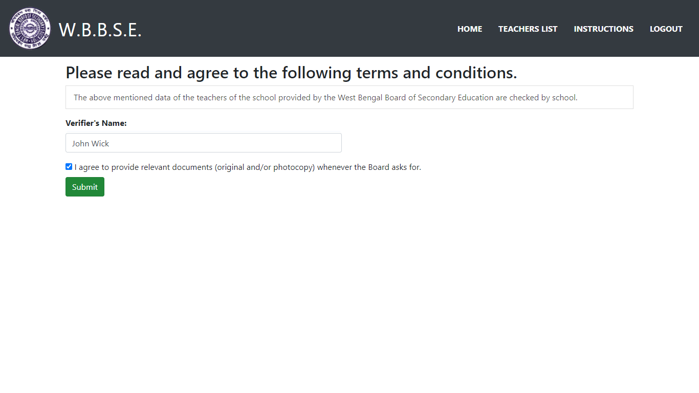 To submit the final data, enter the correct value of Verifier's Name & click on the following checkbox to agree to the mentioned condition (mandatory).