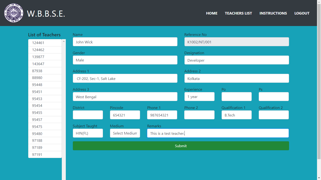 For new teacher, add the required details and click on "Submit" button to submit the data.